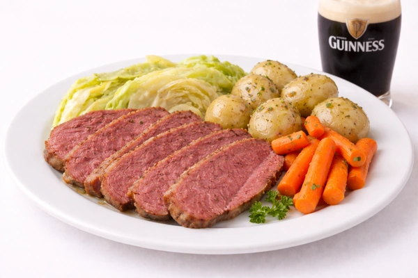 A traditional Irish dish, sliced Corned Beef served with Roasted Rosemary Potatoes & Cabbage