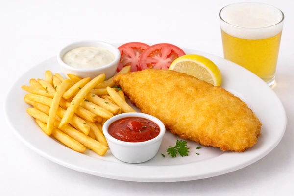Crispy Beer battered Grouper served with French Fries. Tartar sauce & a Lemon wedge on the side